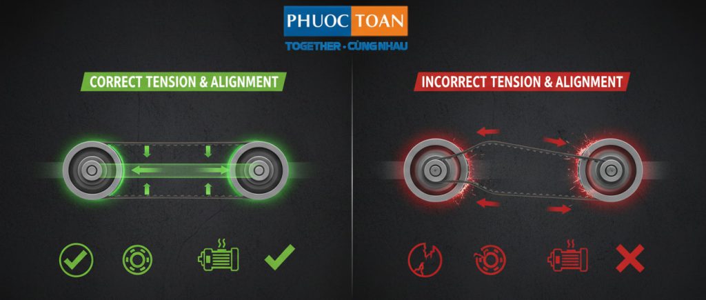 - Quá cao: tăng tải lên bạc đạn, trục và puli → có thể gây cong trục, tiêu hao năng lượng và hỏng các chi tiết phụ trợ.